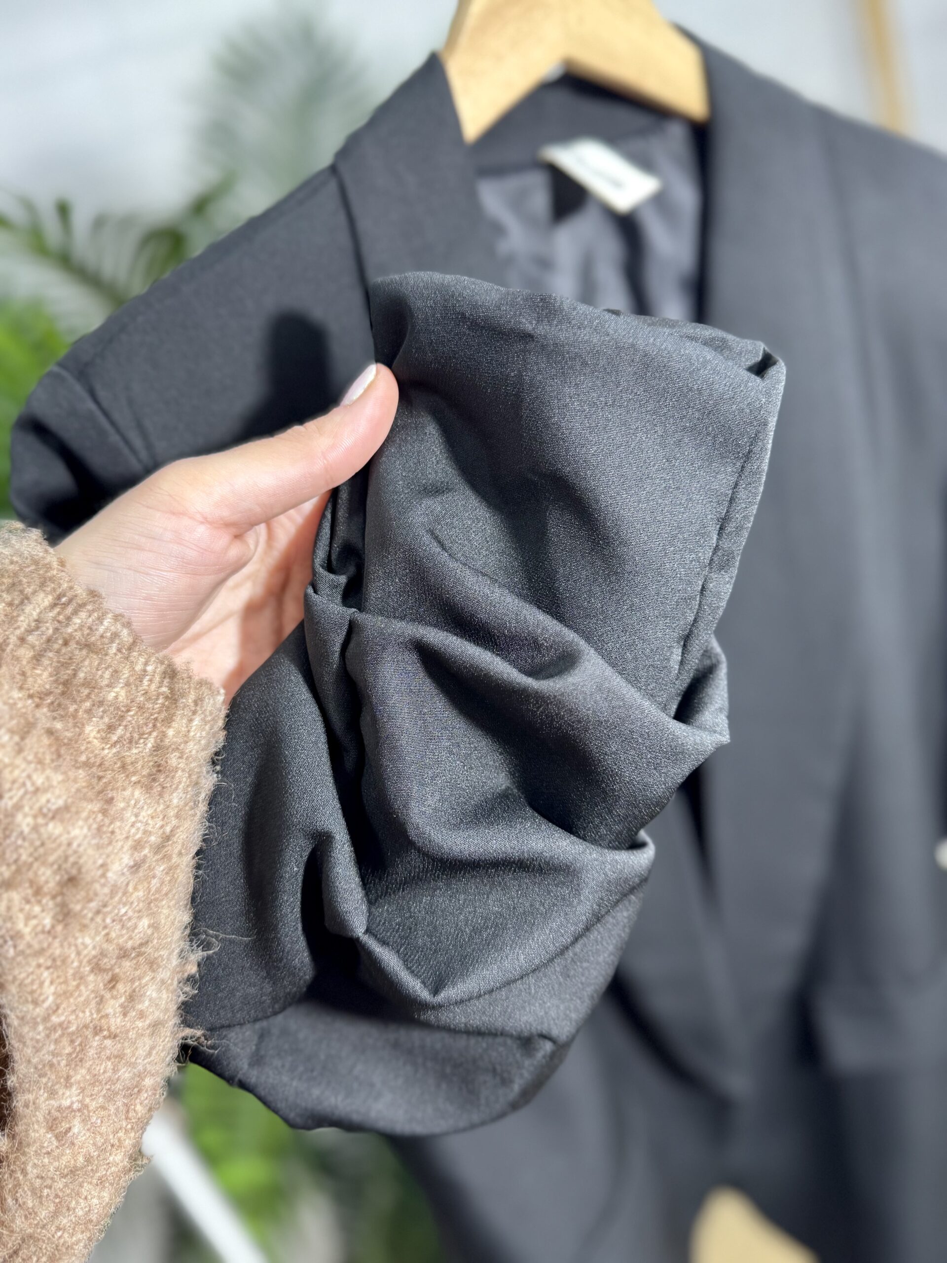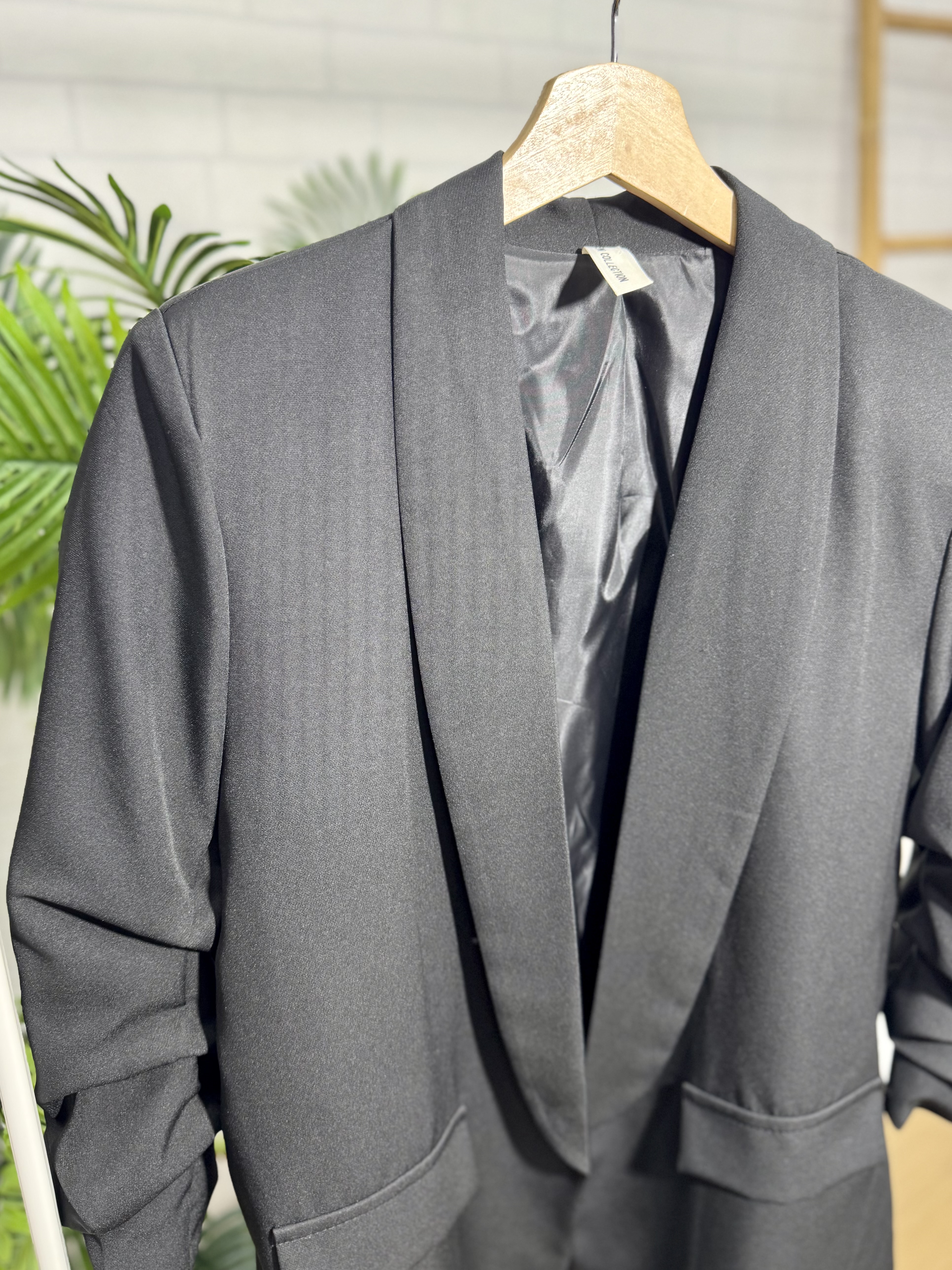 Blazer en color negro con medias mangas recogidas, es una chaqueta abierta y suelta. Es talla única pero va perfecta desde la talla 38 hasta la talla 42.