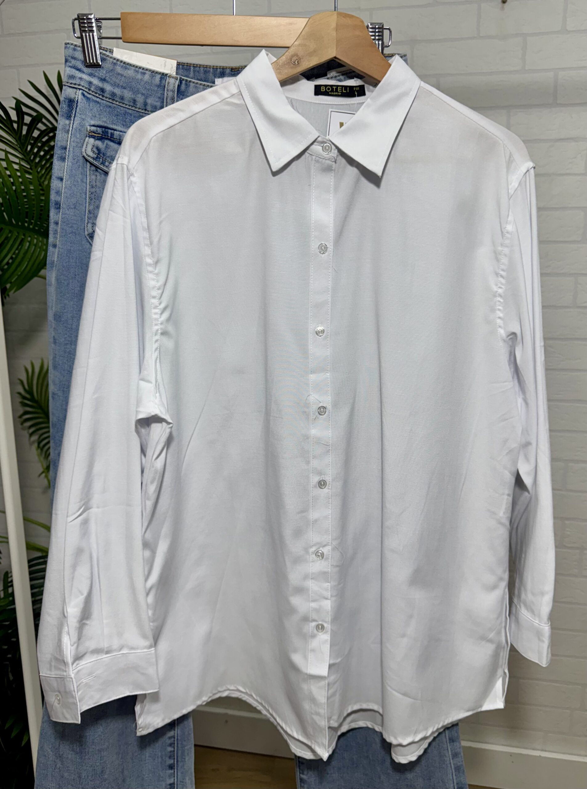Camisa básica blanca abotonada en la parte frontal, va por tallas desde la S hasta la XL.