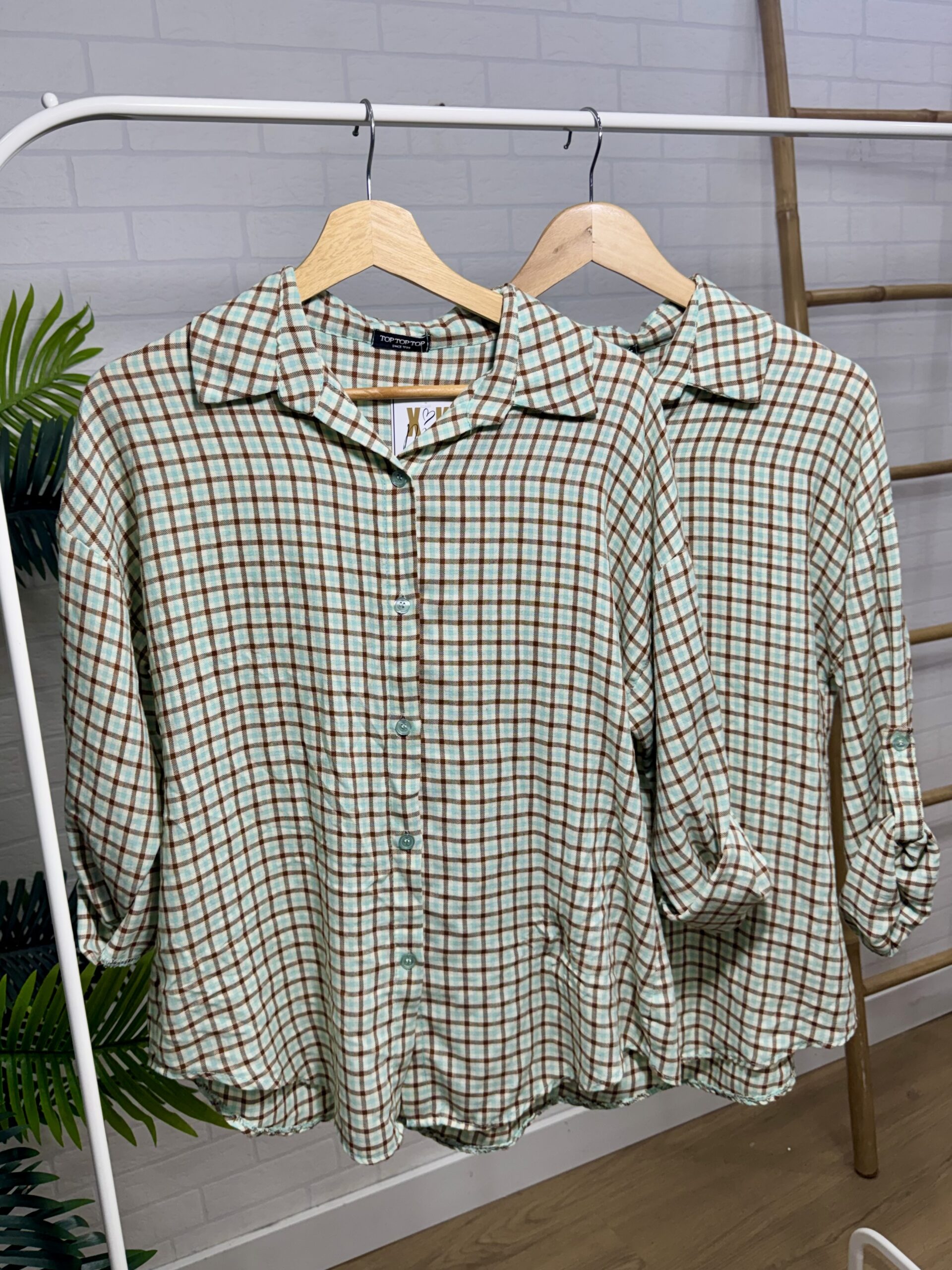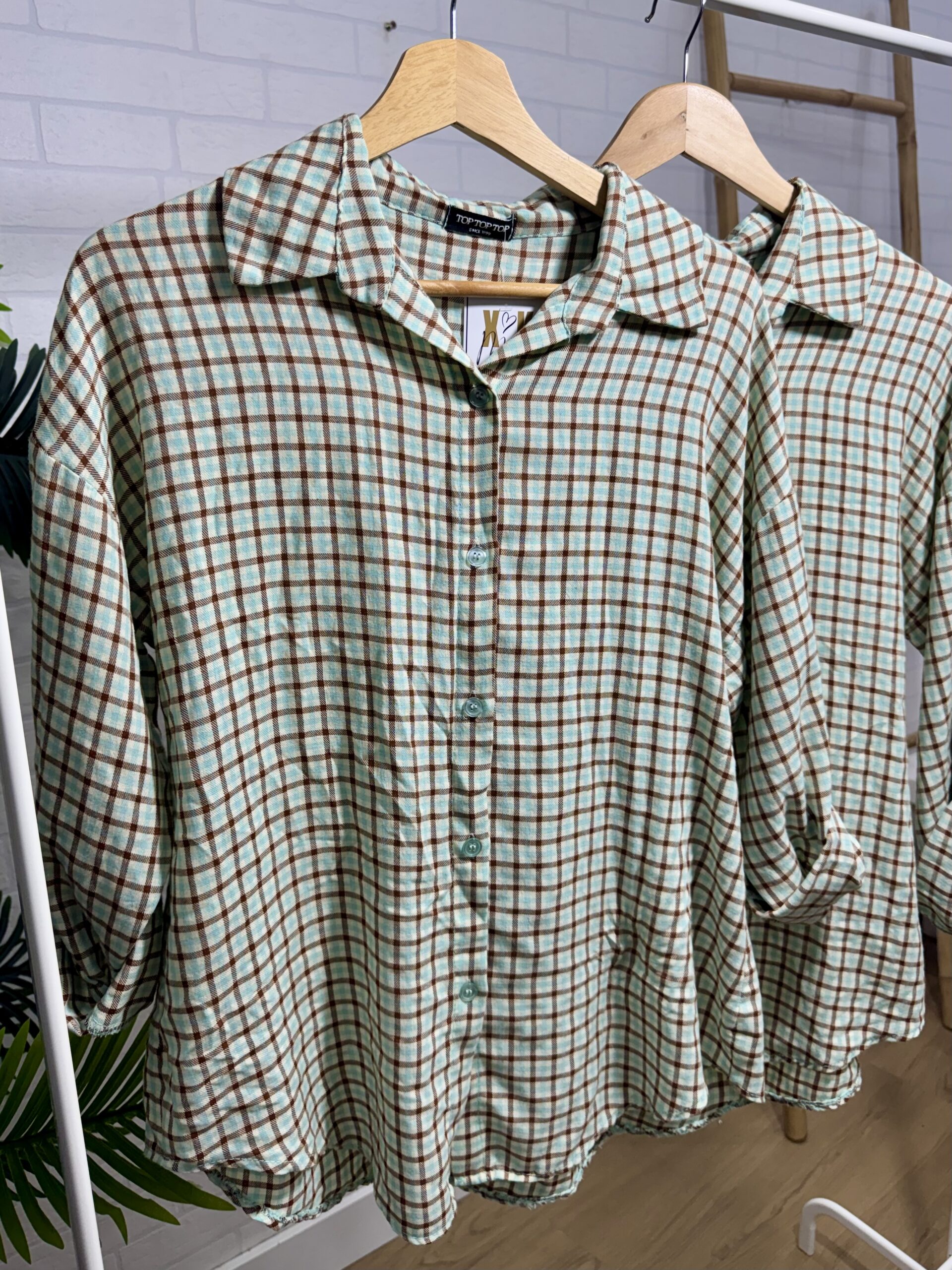 Camisa Vichy en color verde agua con tonos camel y beige, tiene botones en la parte delantera y en las mangas. Es talla única pero va perfecta desde la talla 36 hasta la talla 42.