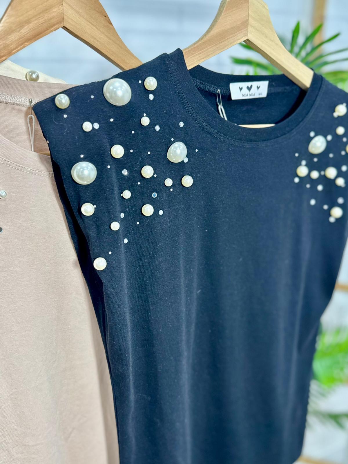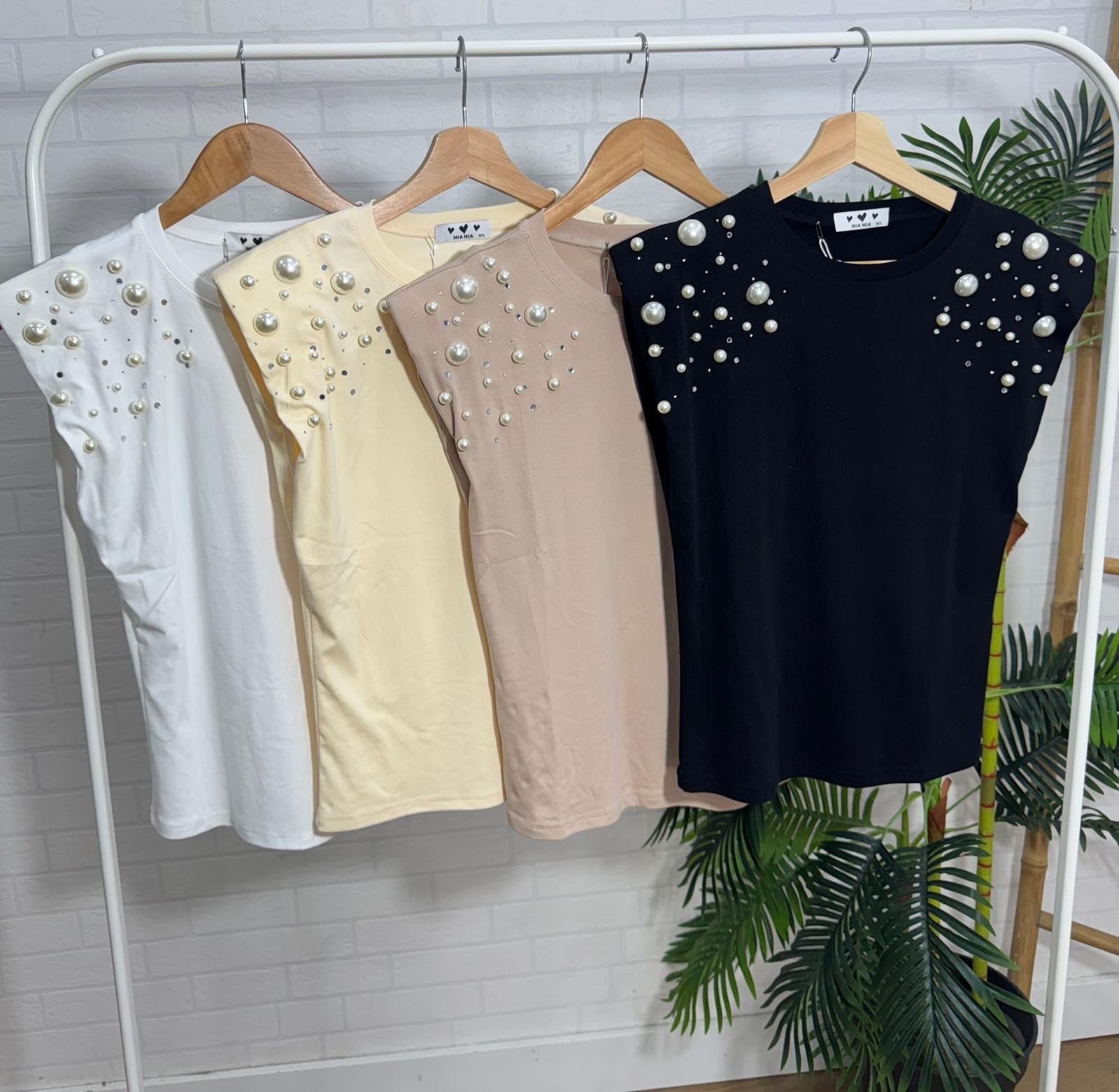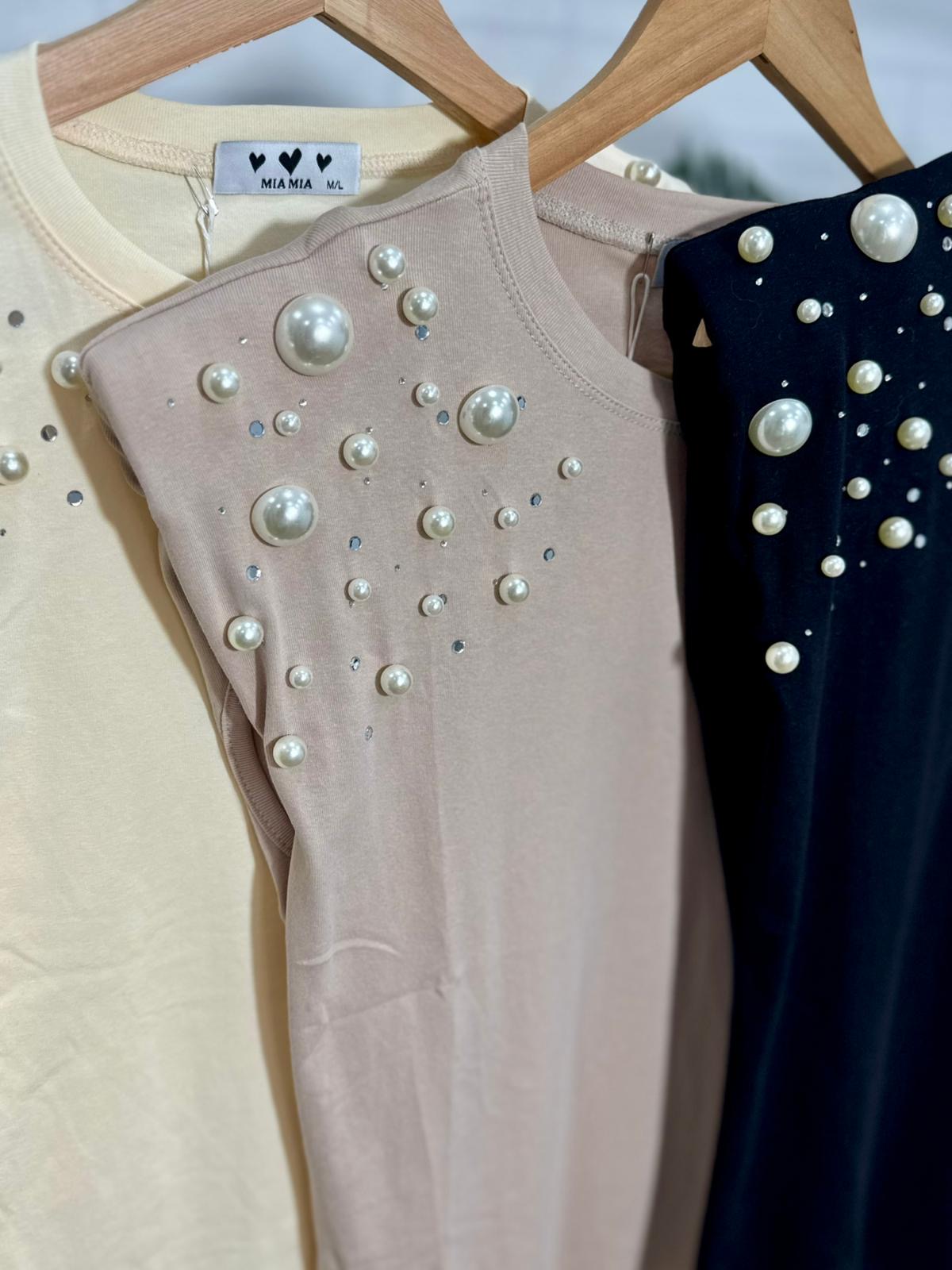Diseño de manga sisa con ligera hombrera estructurada que estiliza la figura y aporta ese toque elegante que tanto nos gusta. El detalle de perlas combinadas en diferentes tamaños junto con pequeñas aplicaciones brillantes en la zona del hombro la hacen sofisticada, femenina y muy versátil.