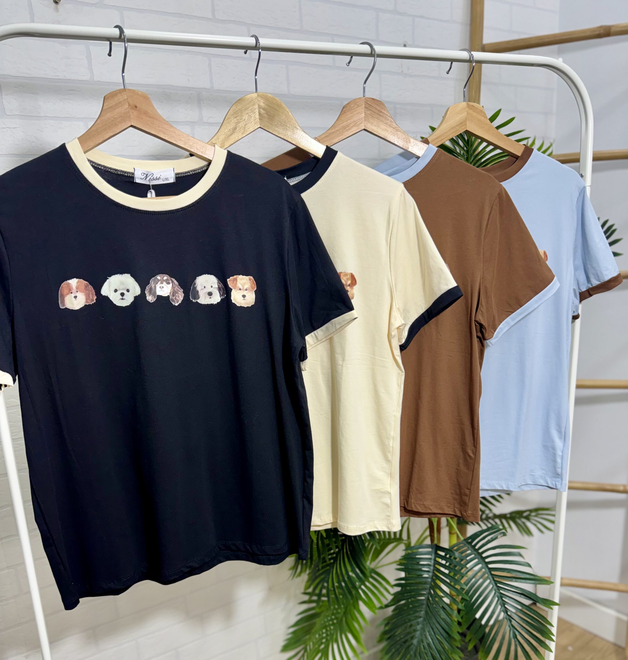 Camiseta de algodón disponible en varios colores con detalles de en la manga y el cuello. Tiene estampado de perritos en la parte delantera y va por tallas.