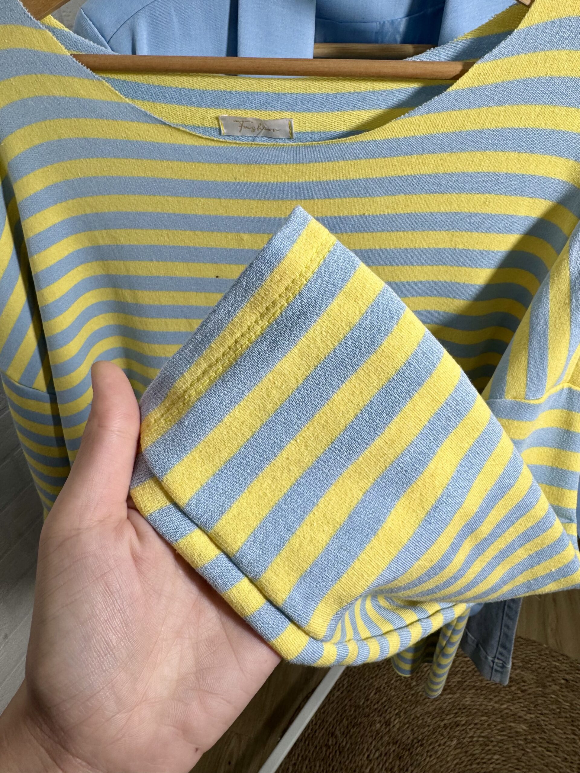 Jersey de tejido fino con estampado de rayas horizontales en tonos azul y amarillo.