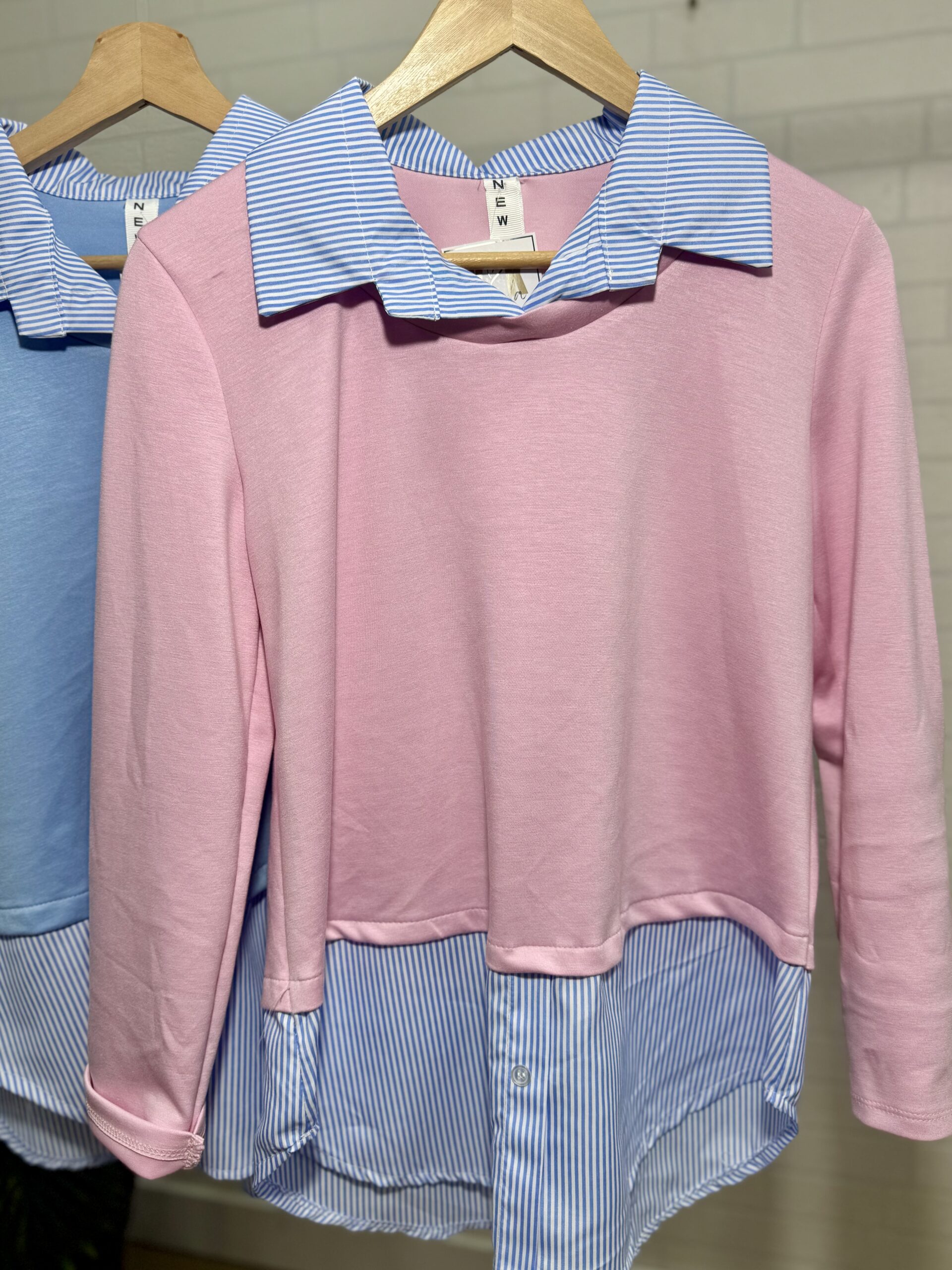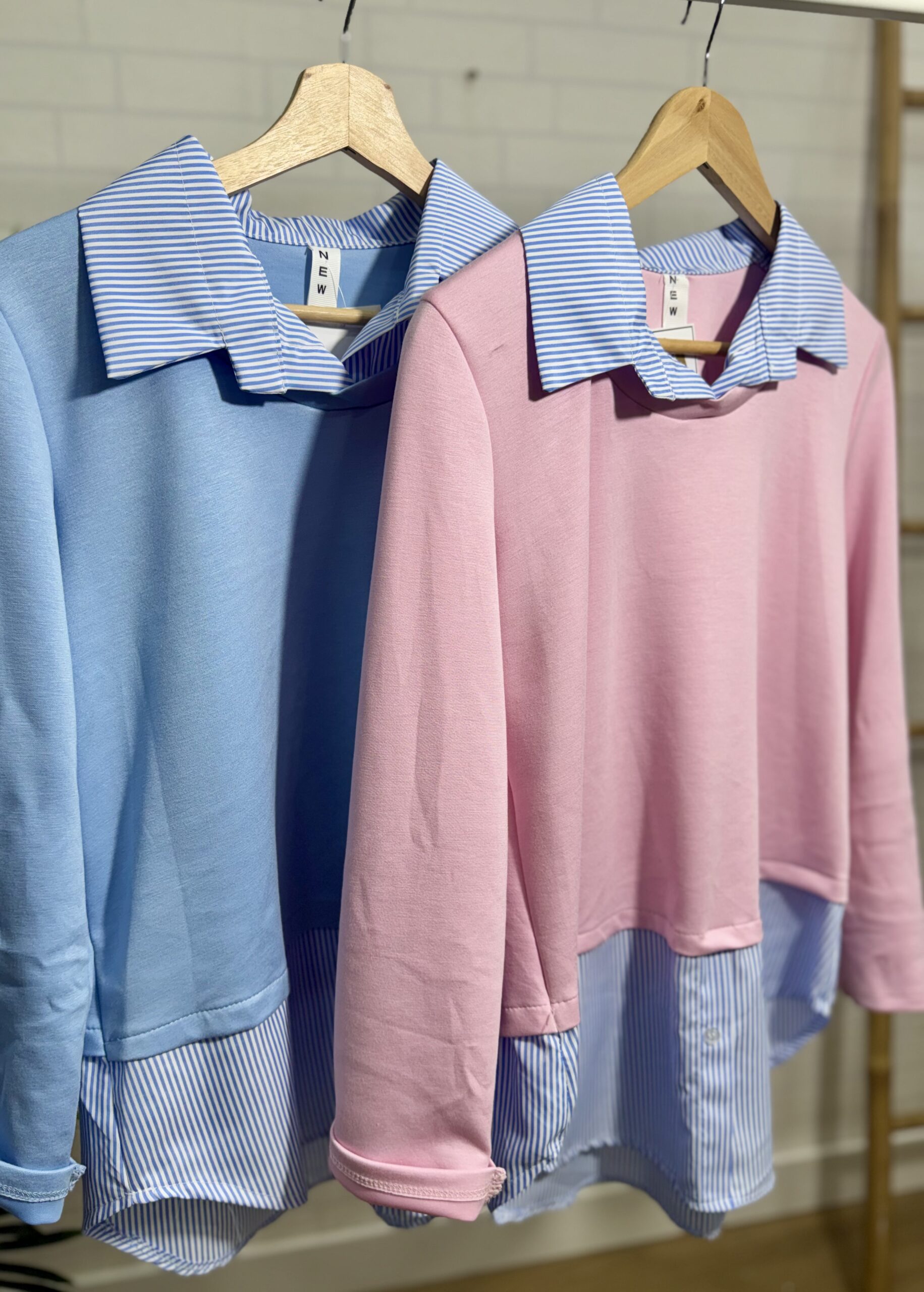 Está sudadera con camisa de rayitas color celeste y blanco incorporada esta disponible en varios colores, tiene tejido de capa de aire y es talla única, da perfectamente desde la talla 36 hasta la talla 42.