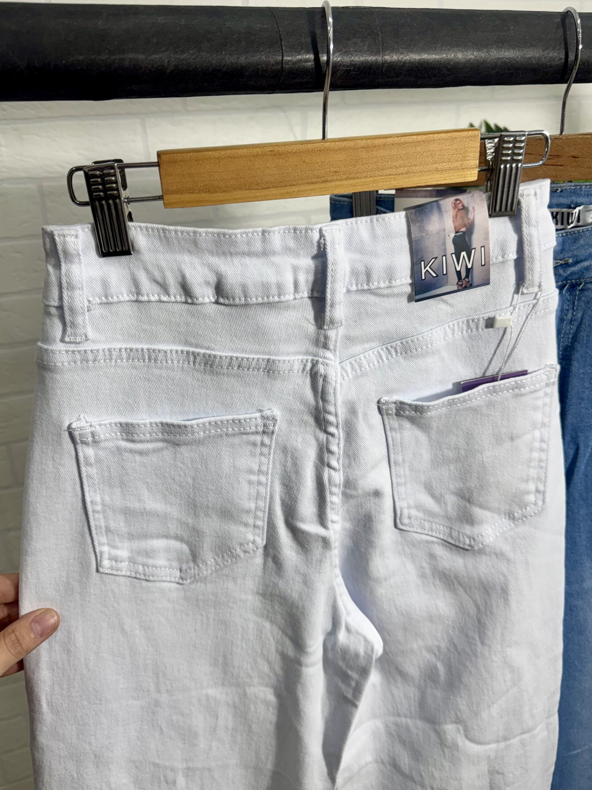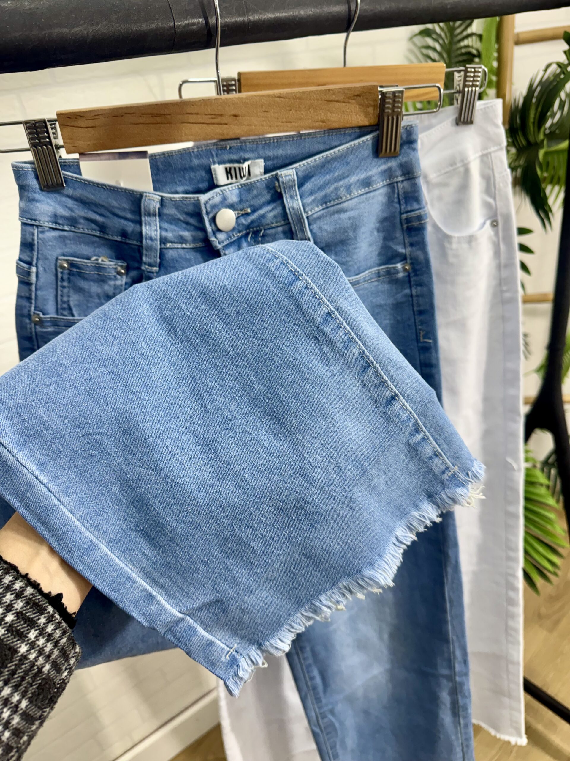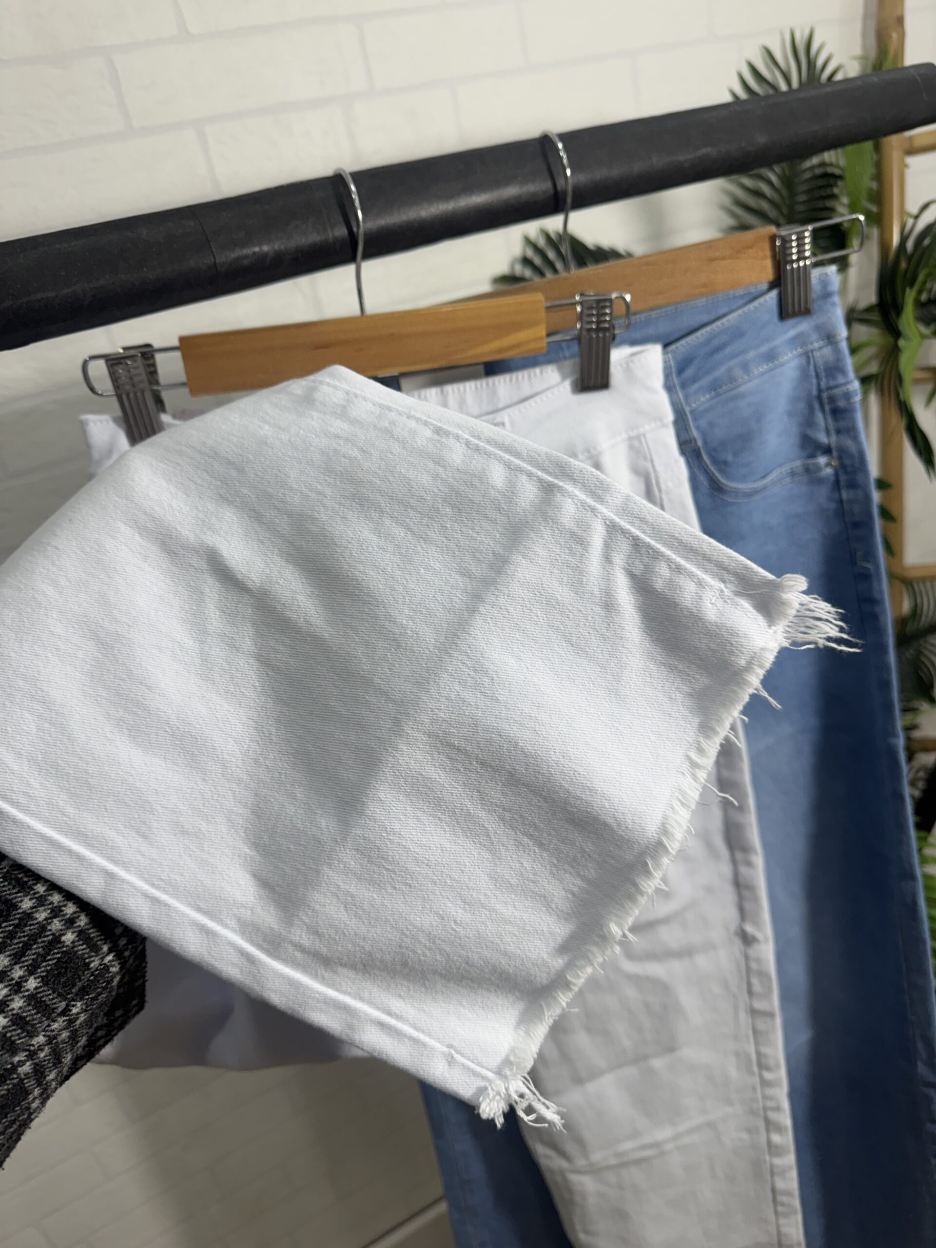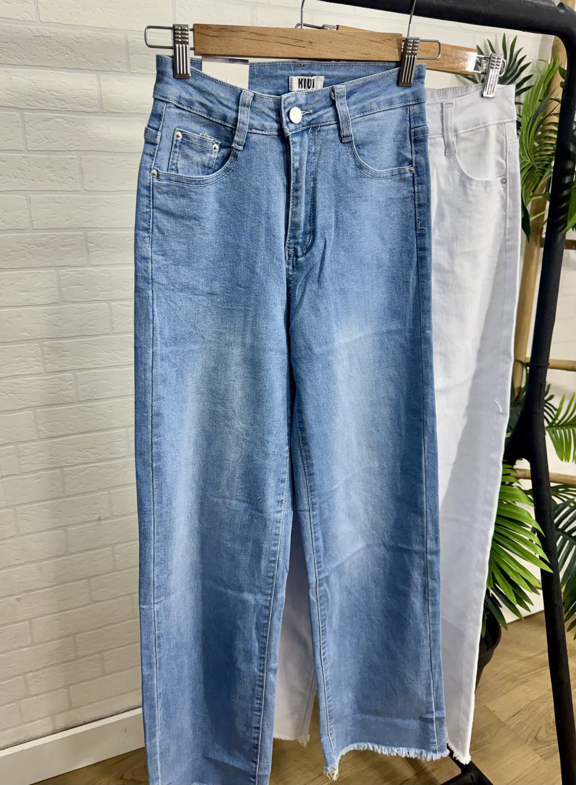 Vaquero wide leg de corte recto disponible en color blanco y en color denim. Viene desde la talla XS hasta la talla XL.